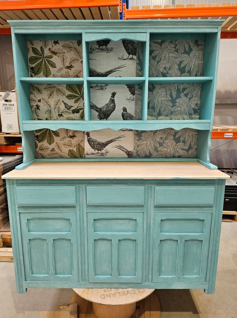 The beautiful Welsh Dresser is already in my garage waiting to be update, I decided to use Annie Sloan Provence Chalk Paint and choose the pheasants wallpaper for the back of the dresser. So far I sanded whole dresser and used wood filler to cover the ornaments on the front of the 3 drawers as I thing it too much, I also removed the glass decorations to give more modern appearance and given one coat of paint…so far L.O.L….updates are pending,