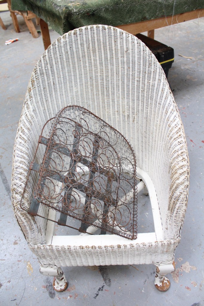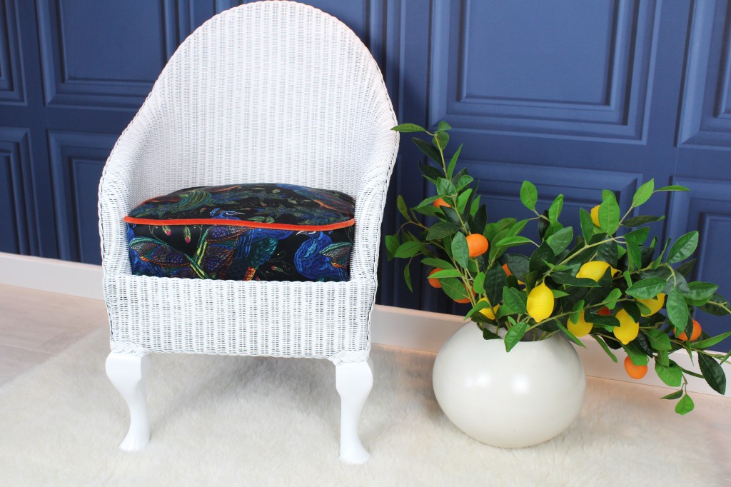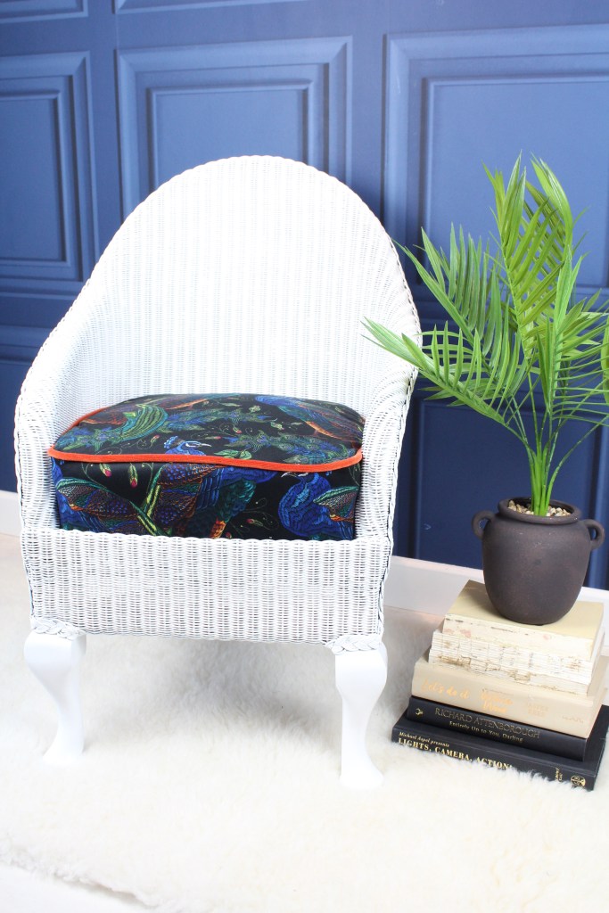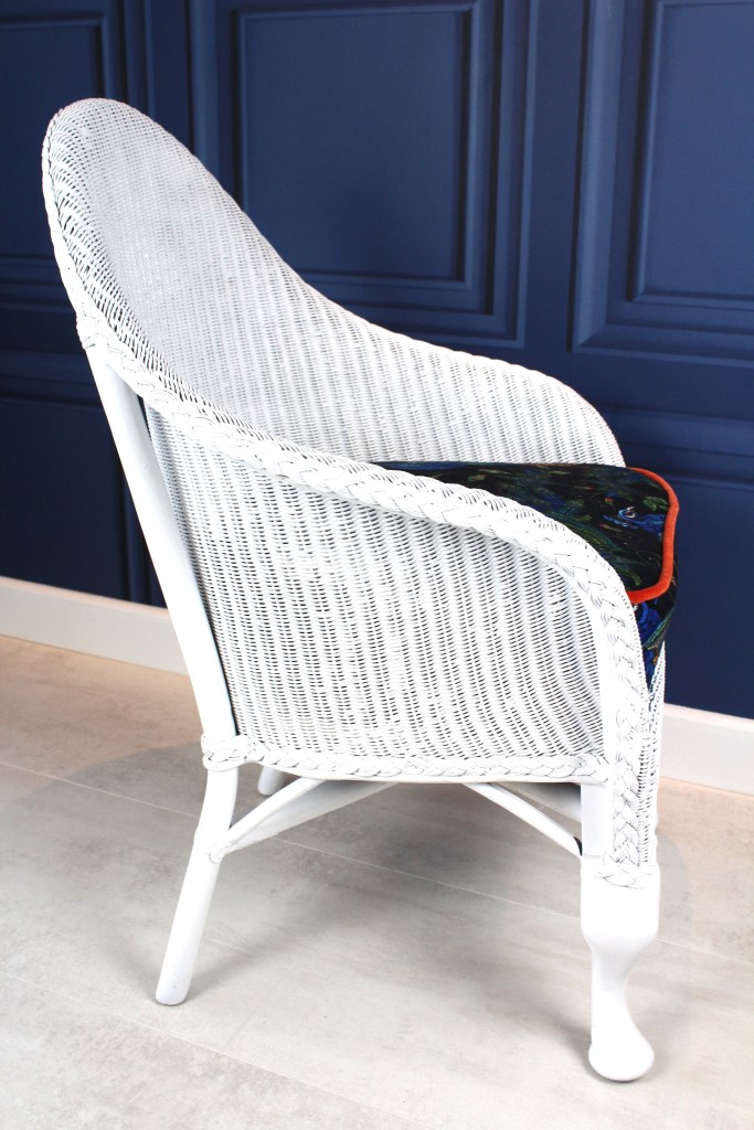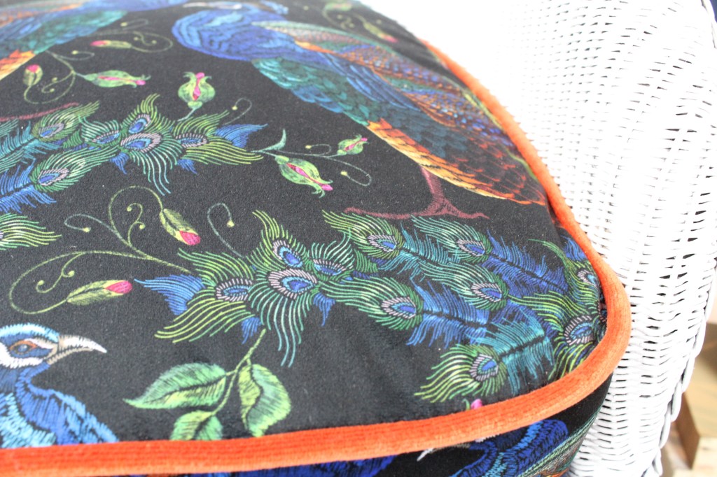 1920-1930 Lloyd Loom chair, no damage to rattan cane work, refinished in satin white, the chair has its original spring base which has been striped back to the bare springs and completely re upholstered, using a beautiful printed velvet, and a bright orange velvet piping, to lift the look and contrast with the bright printed velvet showing peacocks, a rare piece fully restored to a high standard.
