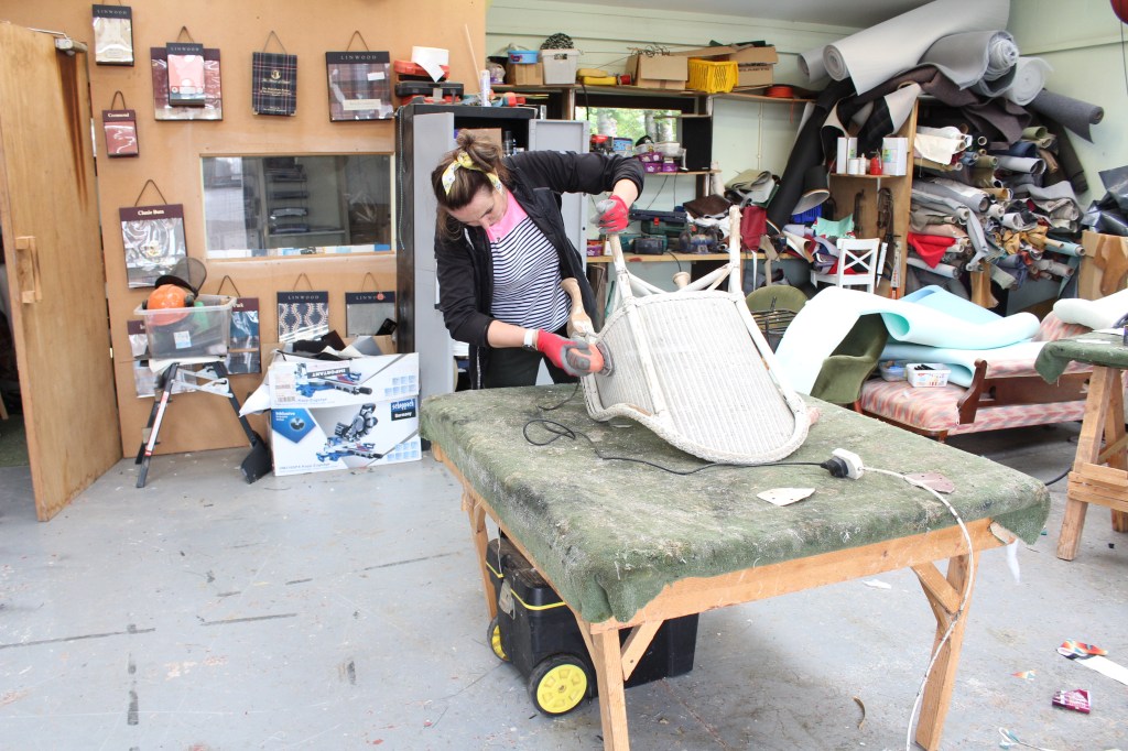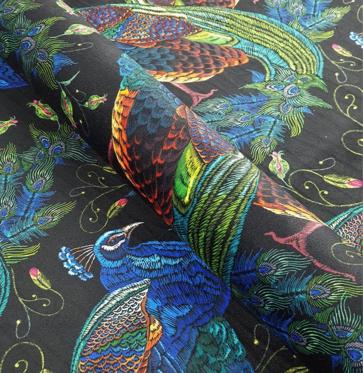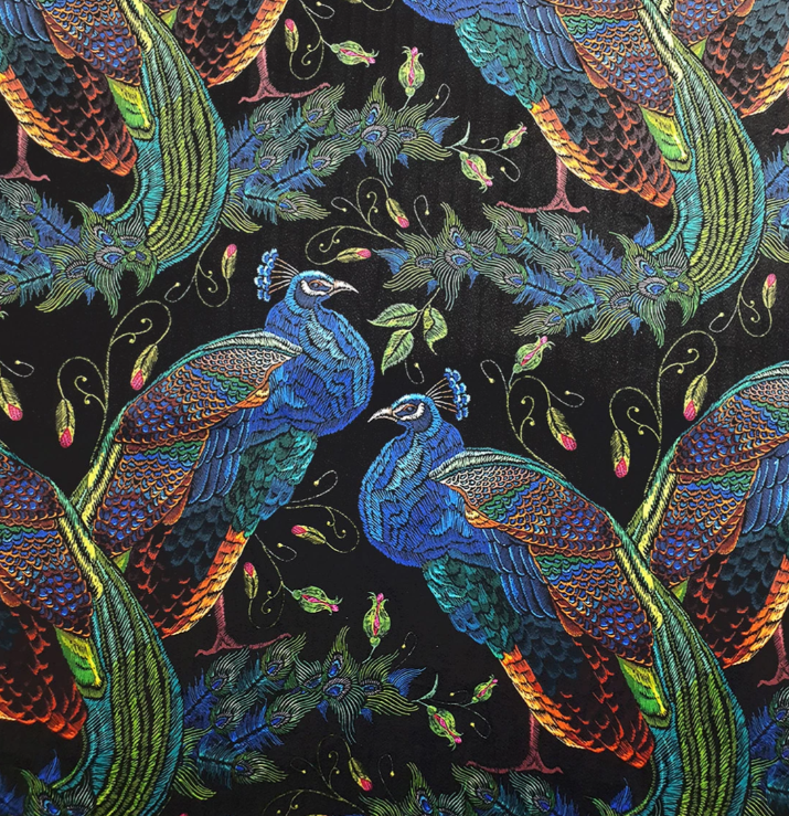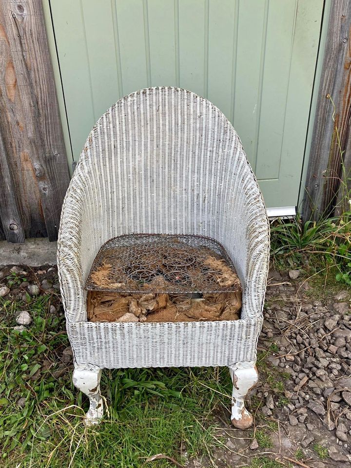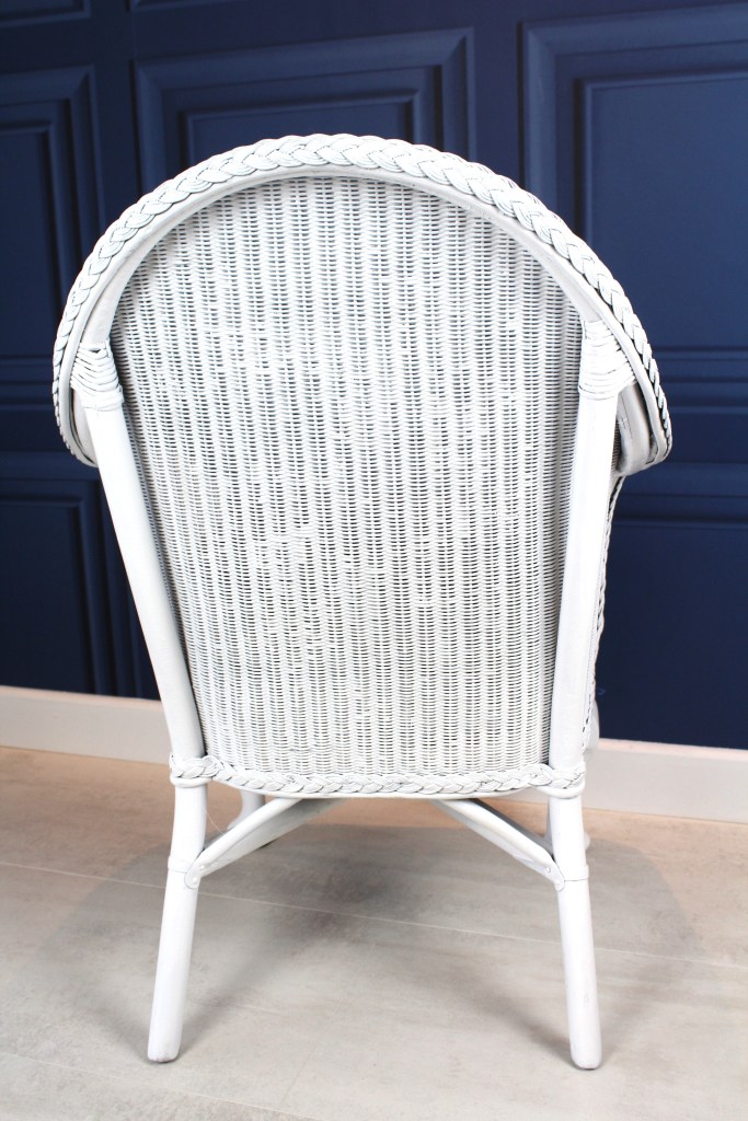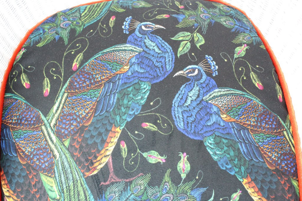 1920-1930 Lloyd Loom chair, no damage to rattan cane work, refinished in satin white, the chair has its original spring base which has been striped back to the bare springs and completely re upholstered, using a beautiful printed velvet, and a bright orange velvet piping, to lift the look and contrast with the bright printed velvet showing peacocks, a rare piece fully restored to a high standard.