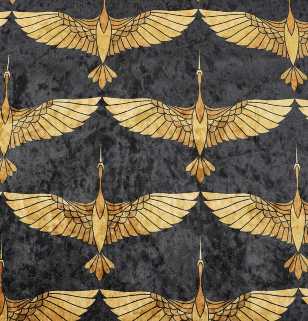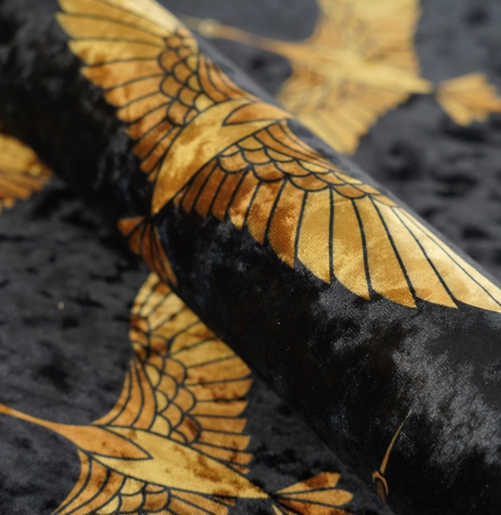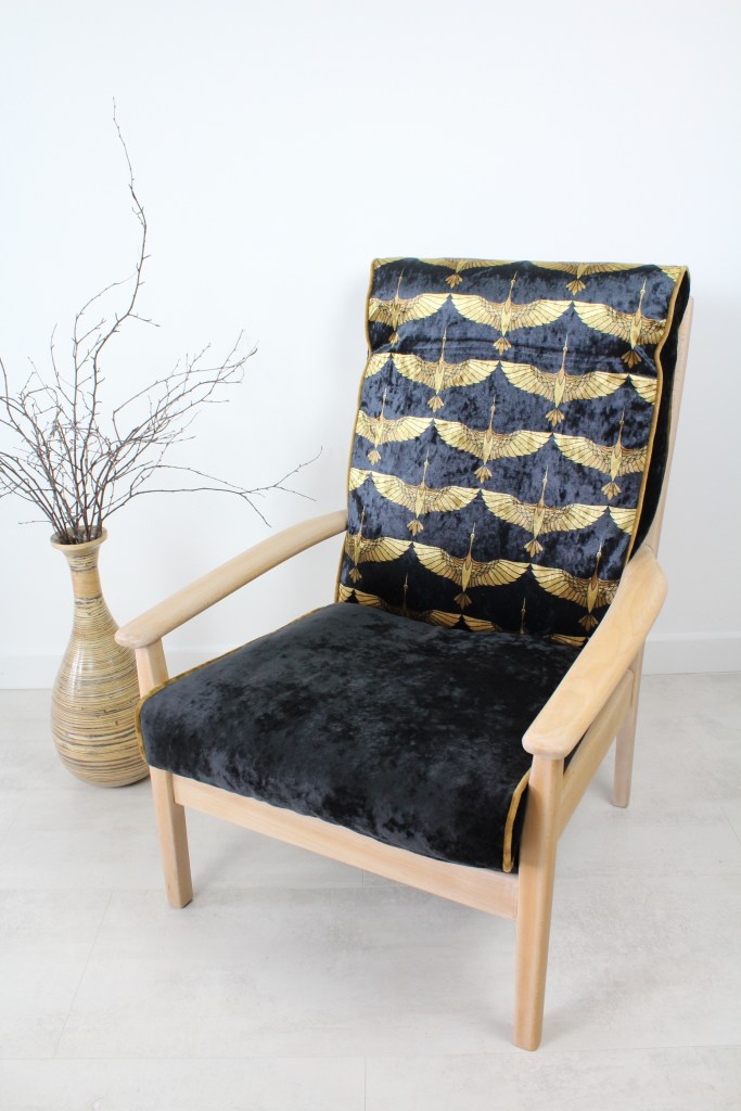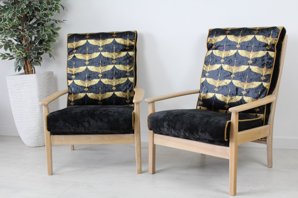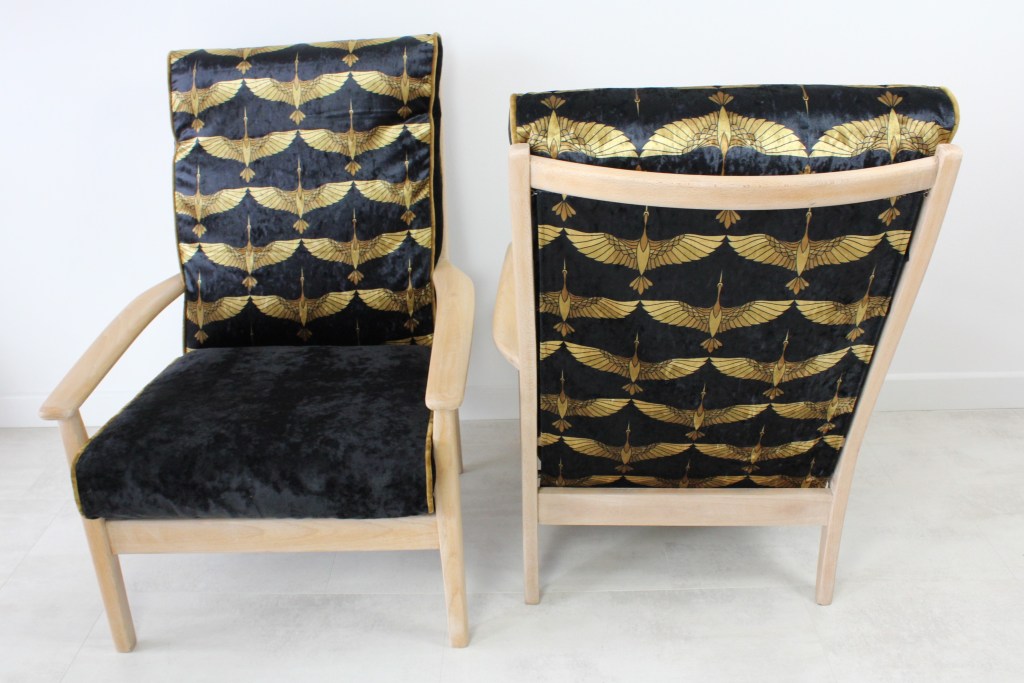 In excellent condition, the chairs original fabric has been striped and completely re upholstered, using a beautiful black printed velvet with gold birds which give the chairs elegant look, the beech frame have been sanded and professionally finished with two coats of wax to give the natural beach wood look.
