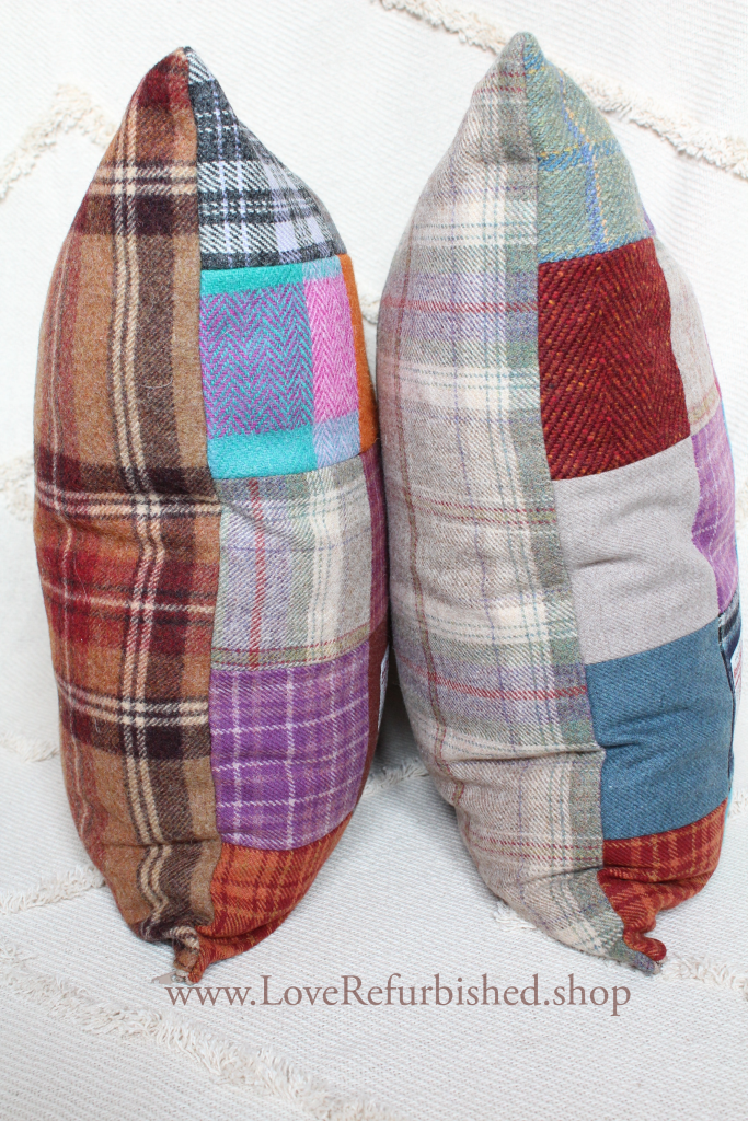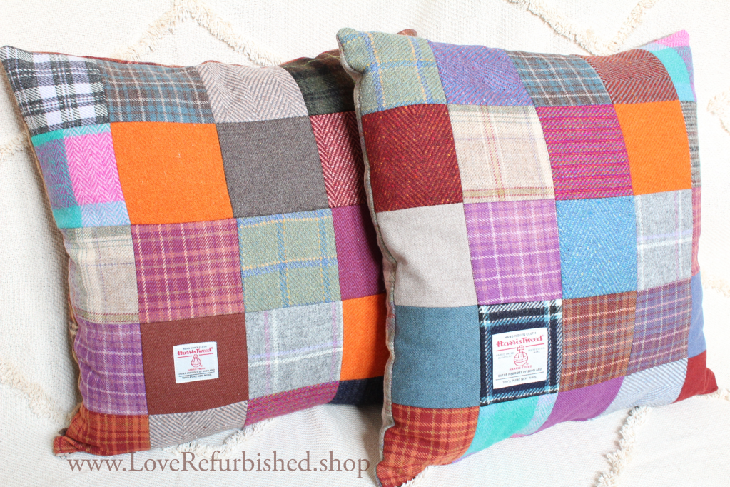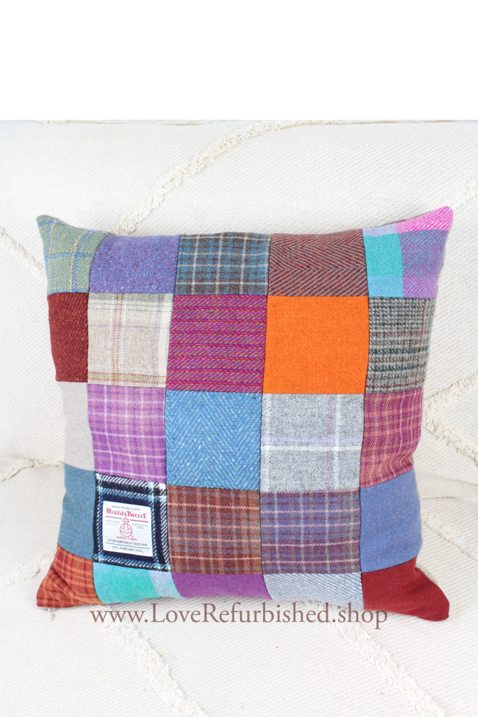 These cushions are made using sustainably recycled fabric remnants, with a mix of genuine Harris Tweed and other lovely bits of wool I’ve collected over time. Each one is pieced together from 12 x 12 cm squares, then sewn up on my sewing machine with care. The finished cushion measures approx 50 x 50 cm. They come with an oversized cushion insert, which helps give them that nice full, plump look that holds up beautifully and doesn’t go flat. There’s a handy zip sewn into the bottom for easy removal, and the back is made from a single contrasting piece of fabric that gives each cushion its own bit of charm.